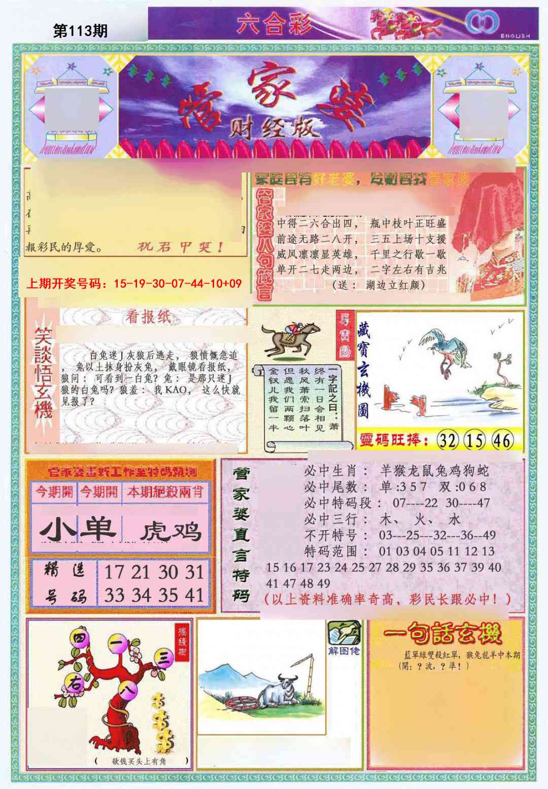 110期:平特五码【03 15 17 41 32】